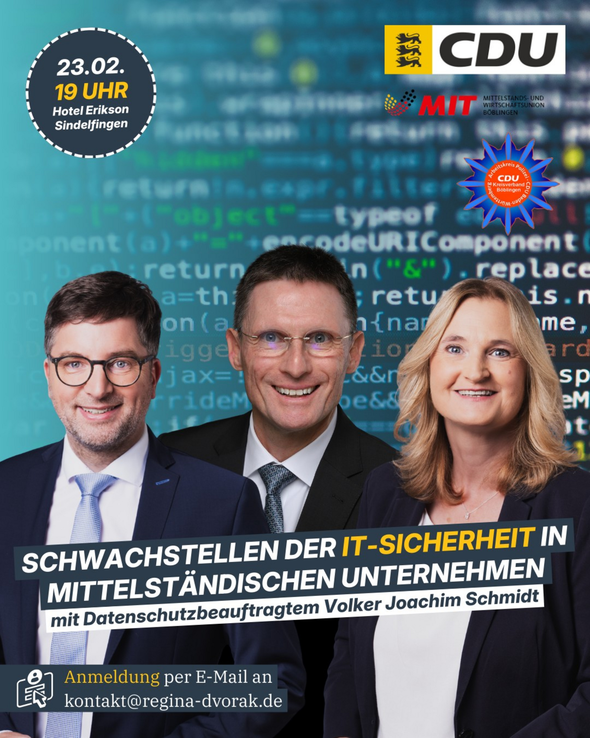 Diese unter polizeipolitischer Sicht sicherlich auch für Privatpersonen aktuell sehr aufschlussreiche Veranstaltung wurde von unserem Arbeitskreis Polizei vorgeschlagen und weitgehend vorbereitet. Unterstützt wird dieser Abend auch von der Mittelstands- und Wirtschaftsunion (MIT) unseres Landkreises.